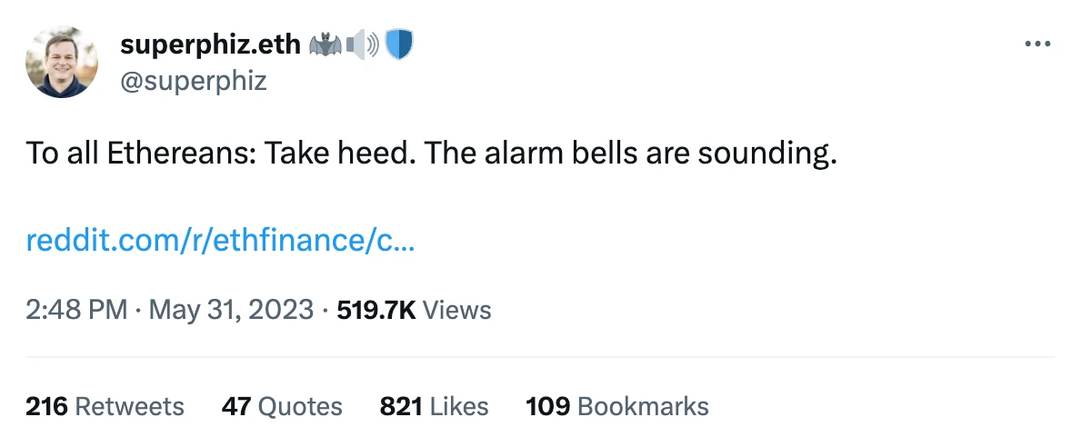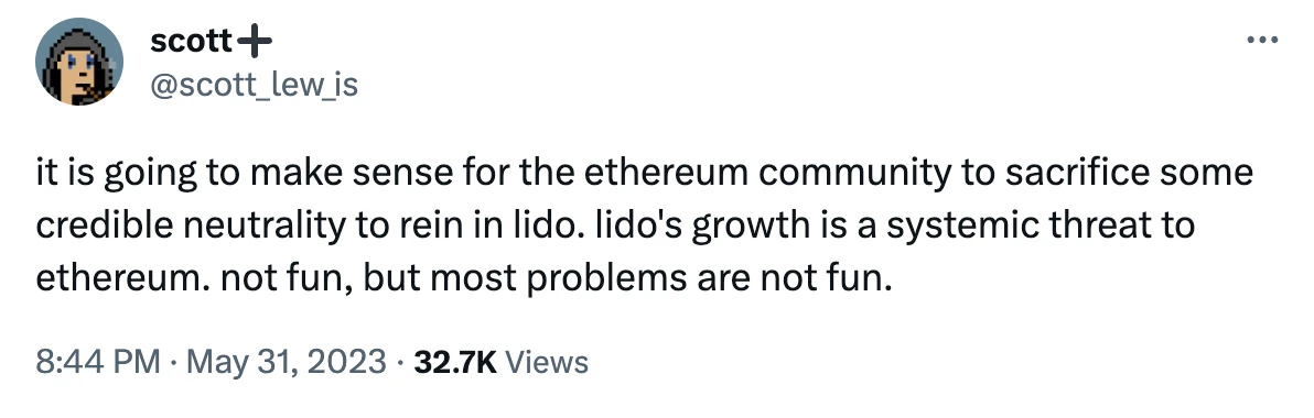Lido治理层对自身持续扩张带来的系统性风险表现出令人担忧的漠视。早在2022年6月,社区就以压倒性多数投票否决了自我限制质押规模的提案。这种拒绝自我约束的行为,表面上看似违背了LDO持有者的利益,实则隐藏着更致命的隐患——随着质押规模持续扩大,未加控制的后果将逐渐显现。
