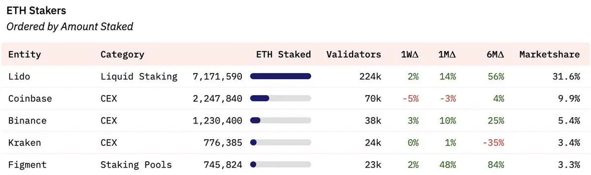 监管的持续收紧,反而加剧了质押市场的集中化趋势,Lido成为最大受益者。尽管Shapella升级开放了提款功能,但Lido的主导地位不降反升,本月新增质押ETH近90万枚,增幅达14.3%。自升级完成以来,Lido的市场份额已从31.4%稳步攀升至31.6%,进一步巩固了其在流动性质押领域的龙头地位。这一趋势表明,监管压力并未削弱Lido,反而为其扩张创造了更有利的环境。