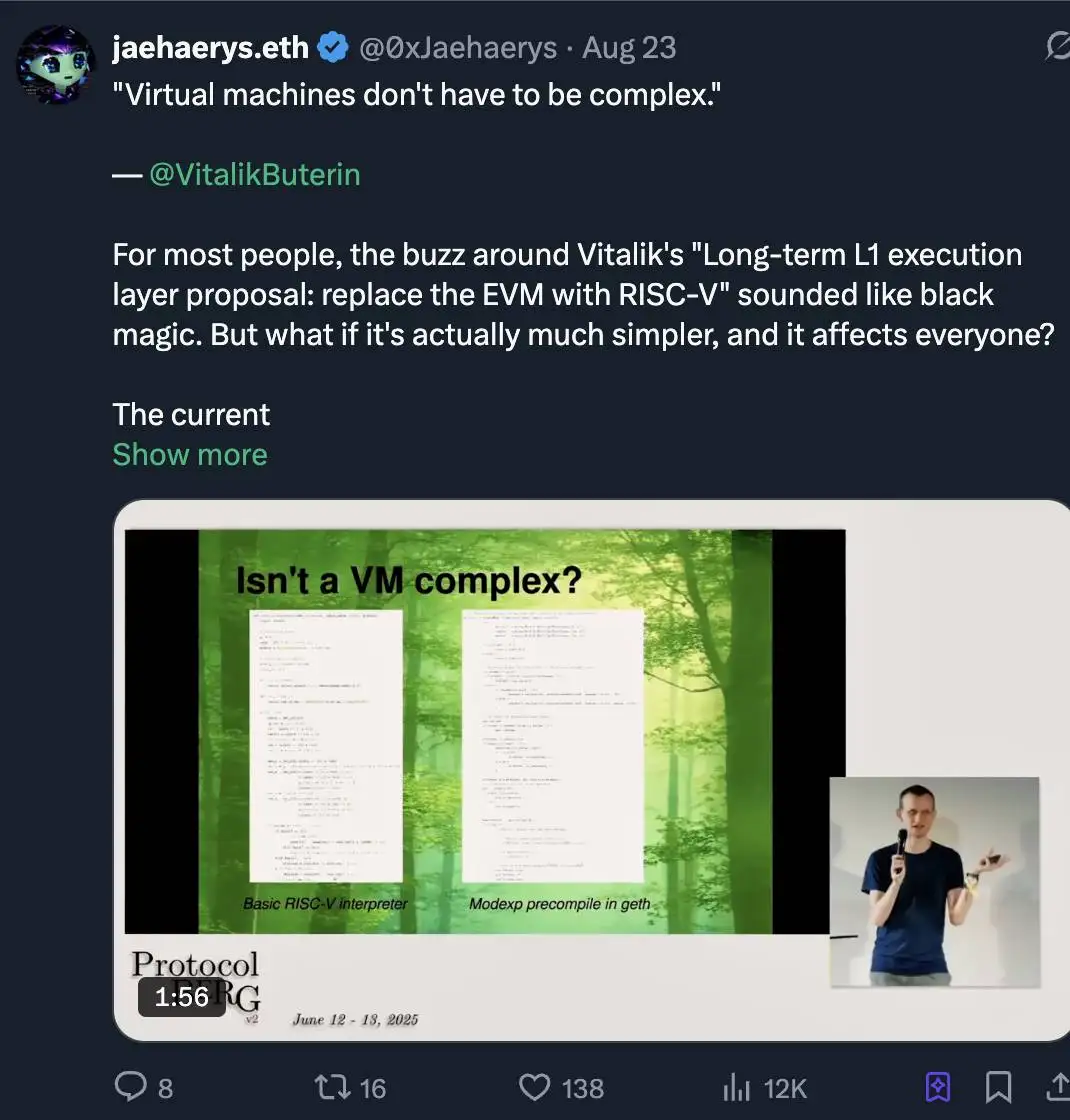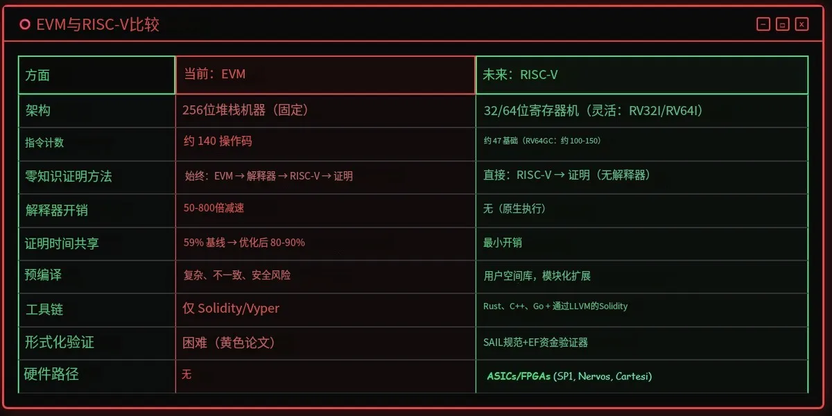 通过采用RISC-V架构,以太坊能够更好地适应这一新角色。RISC-V的极简设计和形式化验证特性,使其成为构建可验证计算系统的理想基础。与EVM相比,RISC-V提供了更简洁、更安全、更高效的基础架构,使以太坊能够专注于其作为信任层的核心功能。