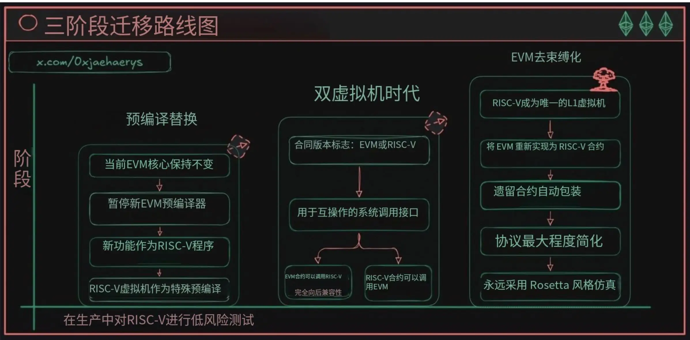 以太坊向RISC-V的迁移被设计为一个渐进、多阶段的过程,以确保系统稳定性和向后兼容性。这一转型将分三步实施,逐步降低风险并增强执行效率。