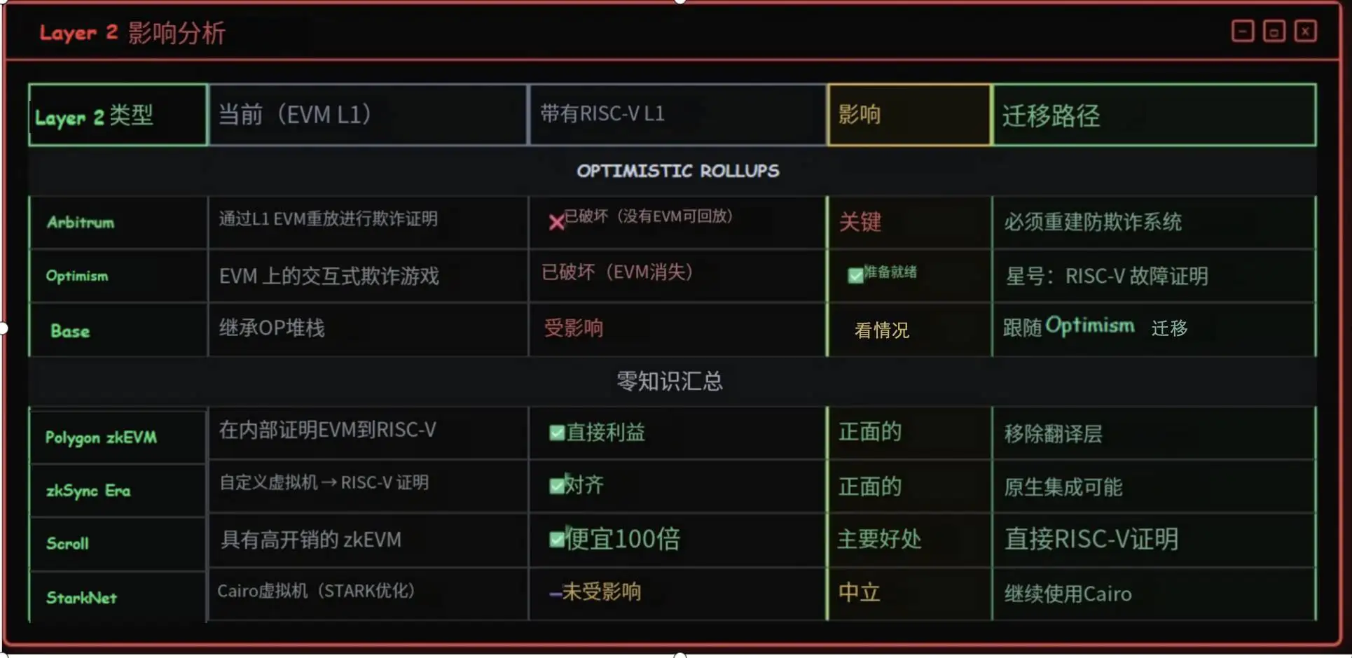 对于依赖欺诈证明机制的Optimistic Rollup(如Arbitrum和Optimism),以太坊L1执行环境的改变将带来根本性挑战。它们的安全模型建立在通过L1EVM重新执行争议交易的基础上。一旦L1放弃EVM,这一机制将失效。这些项目面临两个选择:要么投入大量工程资源,重新设计一套适配RISC-V的欺诈证明系统,要么彻底脱离以太坊的安全框架,转向其他方案。
