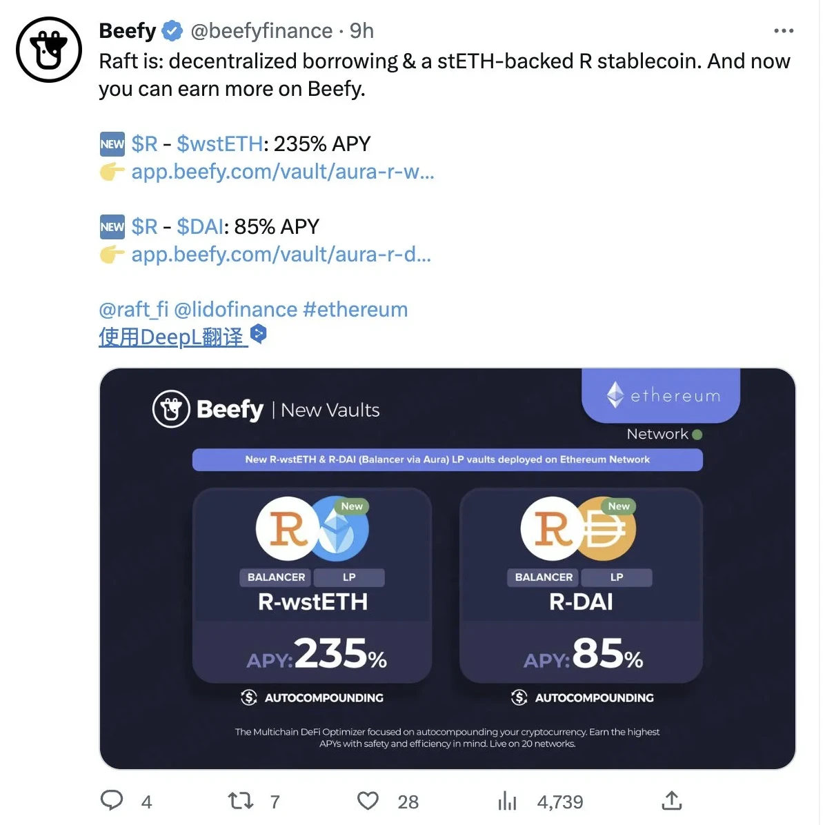 Raft背后聚集了的做市商资源,包括Wintermute、GSR和Jump等知名机构。这些做市商组成的联盟为协议提供了独特的流动性激励方式。Raft通过在Beefy等平台设置高年化收益率(APY)的流动性池,以"慷他人之慨"的方式激励用户参与。这种策略既避免了自身代币价格下跌的风险,又能快速吸引流动性,展现了做市商资本在DeFi领域的高效运作模式。