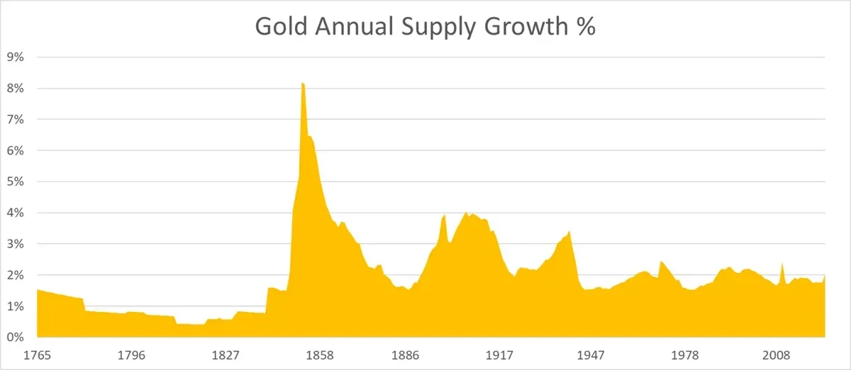ETH的自适应货币政策使其通胀率预计将持续下降。即使100%的ETH被质押,年通胀率最高也仅为1.52%,并随时间逐渐降低,到第100年(2125年)将降至约0.89%。这一结构性优势,远低于美元M2货币供应量6.36%的年均增速,甚至可与黄金的供应增速相媲美,凸显了其作为可靠价值存储资产的潜力。