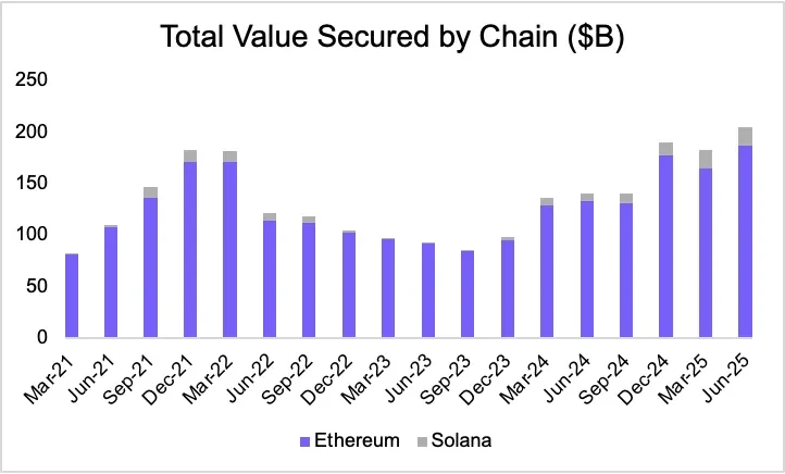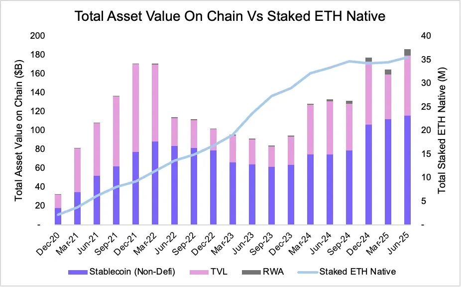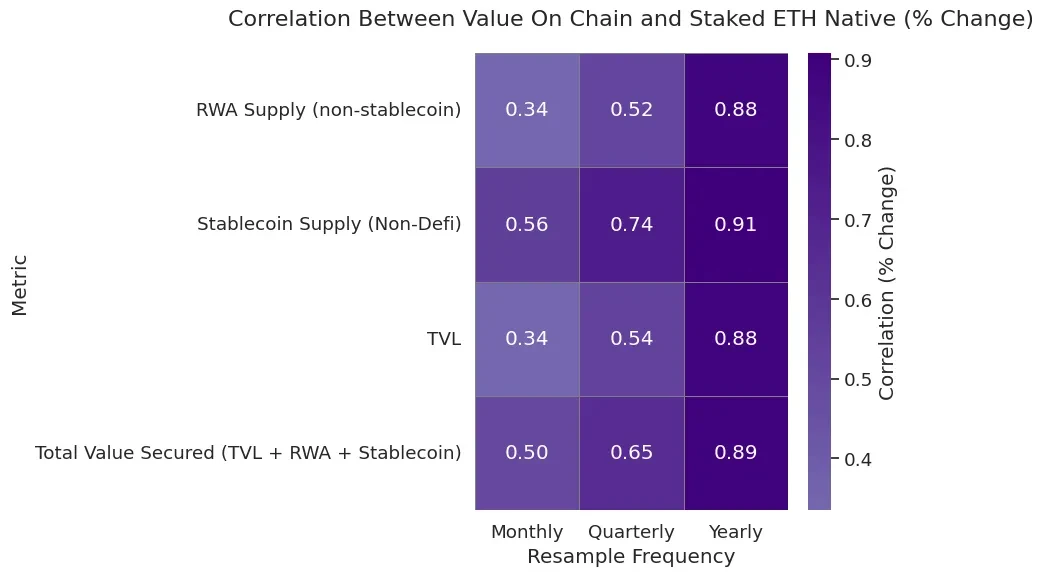数据进一步验证了质押ETH与链上资产规模之间的强关联。随着以太坊上资产价值增长,质押ETH的安全需求同步上升,形成相互强化的正向循环: