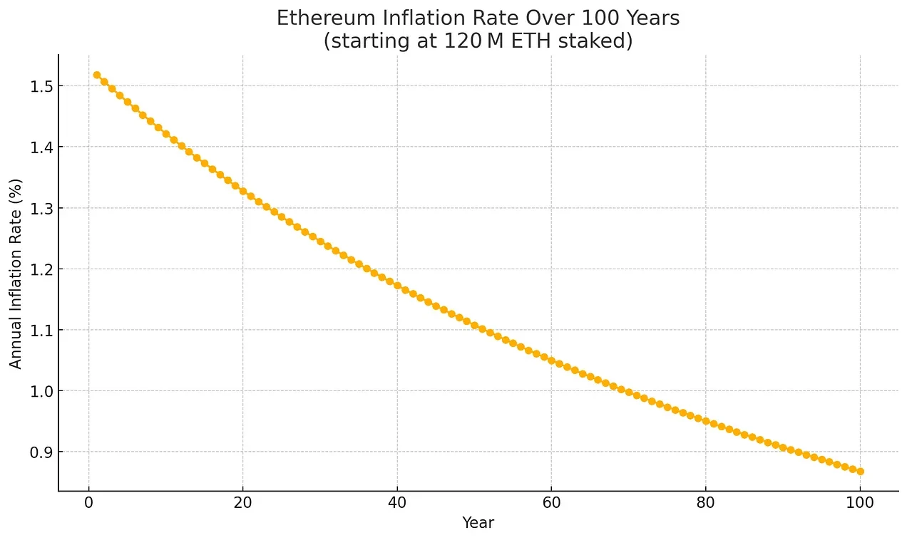 从更长期视角看,这一衰减趋势更为明显,到第100年(2125年)通胀率将降至约0.89%,展现出以太坊内在的货币纪律: