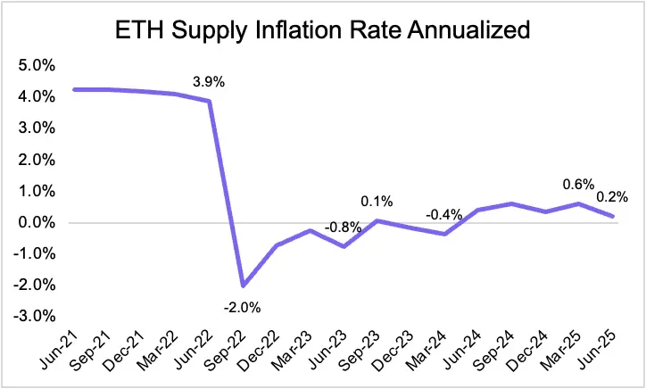 EIP-1559引入的销毁机制进一步增强了ETH的通缩潜力。部分交易费用被永久销毁,使得净通胀率经常低于发行量,甚至周期性出现通缩状态。与美元M2货币供应量6.36%的年均增速相比,以太坊的结构性约束显著提升了其作为价值存储资产的吸引力。事实上,ETH的通胀率已经可以与黄金1.5%的年供应增速相媲美,甚至更低: