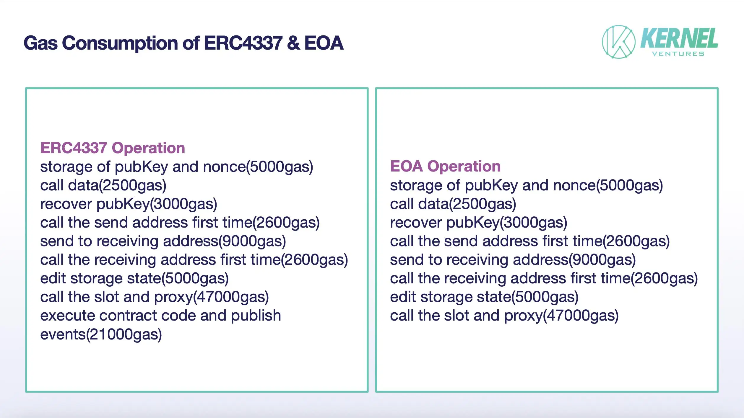 相较于传统 EOA 账户,ERC4337 钱包的基础操作需消耗约 42000 gas,高出近一倍。这部分开销主要源于智能合约的复杂执行逻辑,包括解包 UserOperation 数据结构、执行条件验证、计算链上哈希和记录事件日志等操作。尽管设计上支持批量交易处理以分摊成本,但实际应用中用户很少单次发起大量操作,使得该优势难以发挥。此外,一旦某笔 UserOperation 执行失败,反而会导致整体 gas 损耗上升。